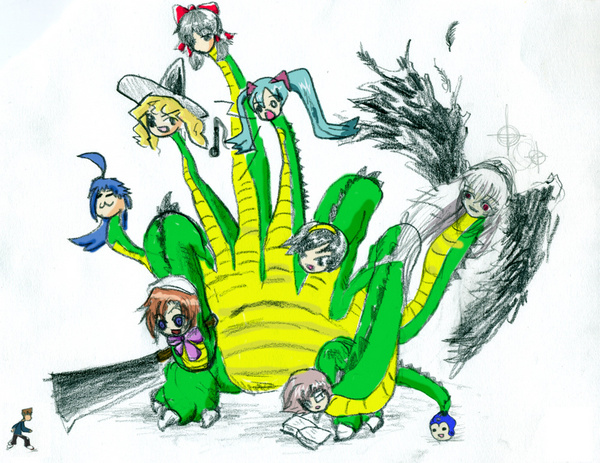 「ニコニコ動画とかで人気のキャラが頭になっているドラゴン。ヤマタノオロチよろしく首が八本あり尻尾もおまけでついている。八回攻撃。主な主砲は竜宮レナ の鉈の一撃。首で器用に鉈を持ち確実に息の根を止めようと執拗に振り回してくる。魔理沙と霊夢は全体攻撃の攻撃の恋符「マスタースパーク」と霊符「夢想封 印」を交互に口から放つ。また、この二首はこちらの攻撃がミスる(かする(GRAZE))と能力が上がる特性がある。ミクの声による攻撃は様々な種類の歌 があり、威力がまちまち。だが中毒効果のある歌の場合即座に戦闘不能状態になるので注意が必要。ハルヒは「全軍突撃」の掛け声ですべての首の一番攻撃力の 高い攻撃を命令して出させる事が出来る。水銀燈は人工精霊を用いた攻撃でほかより素早い上に対空殺傷能力が高い。最早ドールではないためアリスになる事を あきらめ半ば狂乱状態。長門は何もしないで本を読んでいる事がほとんどだが稀に情報連結解除でこちらのパーティー全員を消滅させることがある。こなたは何 もしない。尻尾のロックマン型1upは一回だけ首を生き返らす事が出来る。」(http://www.pixiv.net/member_illust.php?mode=medium&illust_id=326905)