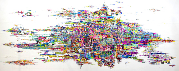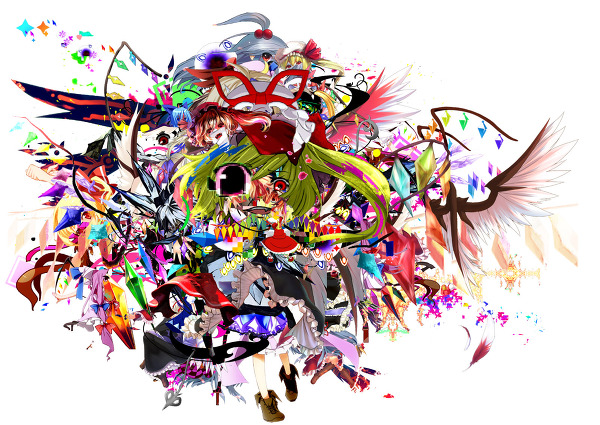 「『東方新超死』。この作品に初めて触れた時、なにかひとつの達成のように思われた(図)。コラージュとしての仕上がりがかなり完成され、一方で絵具の加筆は極端に少なくなった。猥雑感はかなり無くなり、ひとつのパッケージングとして成立しているように思える。使用している画像はすべて「東方Project」シリーズのキャラであり、しかもそれが群体として、「ひとつのキャラ」となっている。解体されたキャラが、それでもなおキャラ的であろうとする「現前性のオバケ」であり、非常に完成度の高い、記号的快楽を持った作品である。そして、「東方」というシーンを一つの絵画で象徴するかのような作品でもある。」(同上)