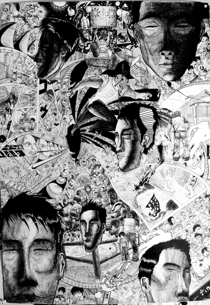 『ニコニコドラゴン』はこのように、様々なキャラの顔と、その特徴的な性質とを怪獣的なベースにコラージュしたキャラクターで、ここからは『東方新超死』など現在の梅沢の仕事につながる様々なキャラのエッセンスが見て取れます。その一方で、梅沢のドローイングには次のような作品もあります。